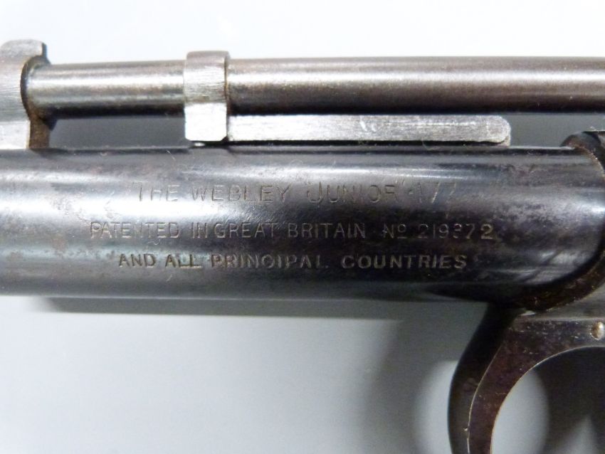 Webley Junior .177 air pistol with reeded metal grips, serial number J15557, in reproduction box with pellets.