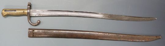 French 1866 pattern chassepot bayonet with 57cm fullered Yataghan blade, stamped 23/02 to crossguard, with scabbard. PLEASE NOTE ALL BLADED ITEMS ARE SUBJECT TO OVER 18 CHECK ON COLLECTION OR DELIVERY