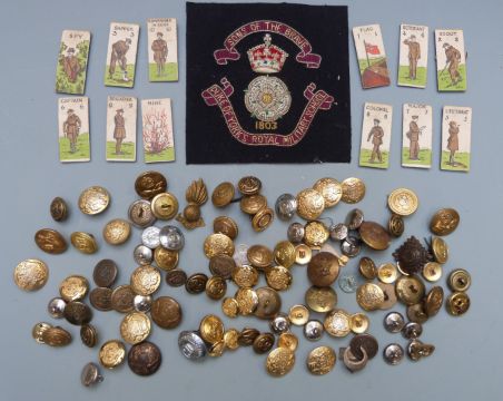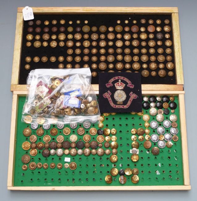 Collection of buttons including Royal Observer Corps, Royal Air Force, Artists Rifles, Royal Coat of Arms etc, mounted on two boards