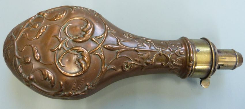 G & JW Hawksley copper and brass powder flask with embossed scrolling decoration around birds, 21cm long