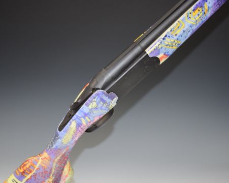 Beretta 686 Essential 12 bore over and under ejector shotgun with signed black lock, custom colored camo stock and forend, semi-pistol grip, vented top rib, single selective trigger and 28 inch multi-choke barrels, overall length 115cm, length of pull 37cm, serial number L69332B, together with the original stock and forend, three additional chokes and choke key. PLEASE NOTE THAT A VALID RELEVANT FIREARMS/SHOTGUN CERTIFICATE IS REQUIRED TO HANDLE/PURCHASE THIS ITEM.