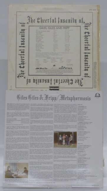 Giles, Giles and Fripp - Metaphormosis (TP049) number 31 of 1000 and The Cheerful Insanity Of (SPA423), both records and covers appear Ex less slight staining to Cheerful on rear