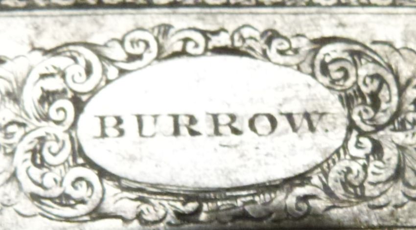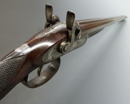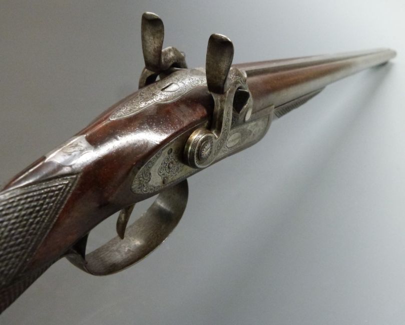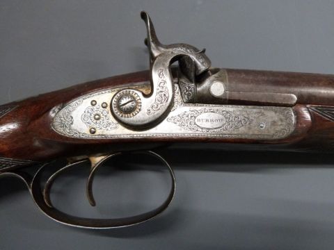 James Burrow of Preston 18 bore double barrelled side by side percussion hammer action sporting gun with named locks, finely engraved locks, hammers, trigger guard, butt plate, top plate and mounts, brass tipped wooden ram-rod, chequered grip and forend, double trigger, monogrammed inlaid silver shield shaped wrist cartouche and 28 inch silver inlaid Damascus barrels engraved '1 James Burrow Maker 116 Fisher Gate Preston', overall length 113cm, serial number 4568, originally one of a pair.