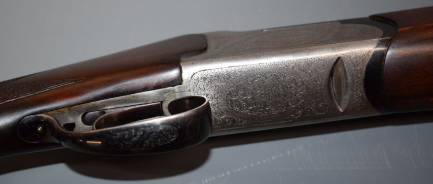Lanber 12 bore over and under ejector shotgun with floral engraved locks, underside, trigger guard and underlever, chequered semi-pistol grip and forend, single selective trigger, vented top and central ribs and 27.5 inch multi-choke barrels, overall length 113cm, length of pull 36.5cm, serial number 284275. PLEASE NOTE THAT A VALID RELEVANT FIREARMS/SHOTGUN CERTIFICATE IS REQUIRED TO HANDLE/PURCHASE THIS ITEM.