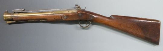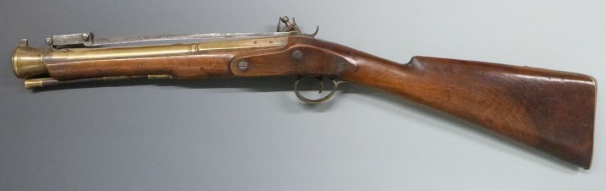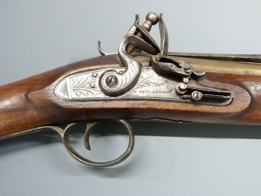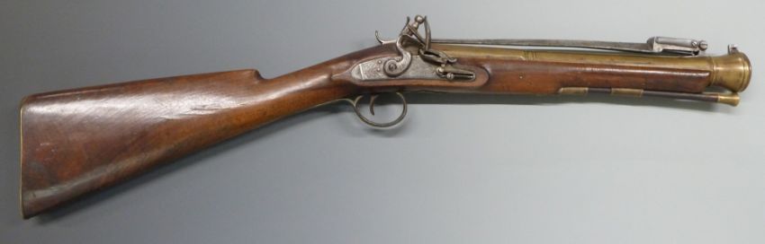W Ketland & Co flintlock hammer action blunderbuss with sprung bayonet, named and engraved lock, engraved brass trigger guard, butt plate and mounts, brass tipped wooden ram-rod and 14 inch brass barrel engraved 'London', overall length 77cm, serial number 15107.