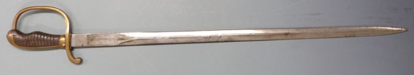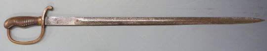 Continental 19thC sword with stirrup guard and wooden grip, the 67cm double edged blade with some crude etching, complete with steel scabbard. PLEASE NOTE ALL BLADED ITEMS ARE SUBJECT TO OVER 18 CHECK ON COLLECTION OR DELIVERY