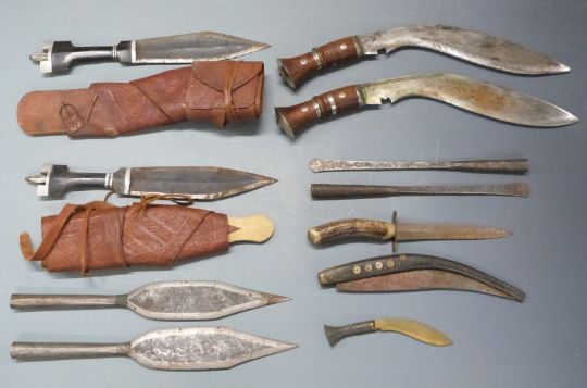 Two kukri knives, blade length 30cm, two tribal knives in sheaths, spear heads etc. PLEASE NOTE ALL BLADED ITEMS ARE SUBJECT TO OVER 18 CHECK ON COLLECTION OR DELIVERY