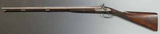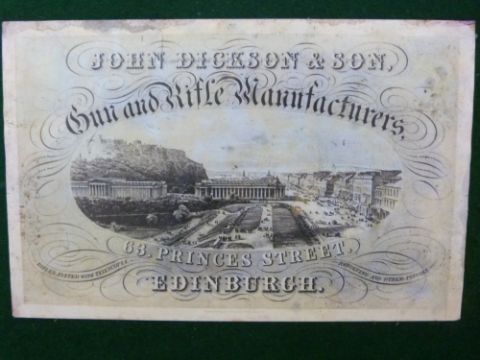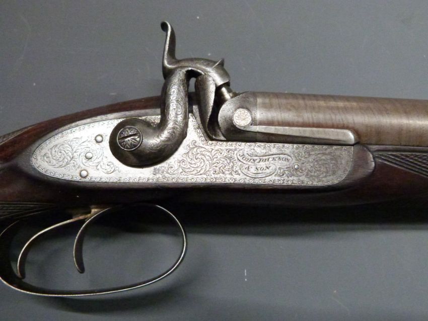 John Dixon & Son 14 bore percussion hammer action gun with named and engraved lock, engraved scene of a dog flushing birds to the trigger guard, stylised dolphin hammers, engraved top plate, butt plate and mounts, chequered grip and forend, brass tipped wooden ram-rod, carved tear drop to the wrist, cartouche to the underside of the stock, double trigger and 29.5 inch Damascus barrels stamped JD&S, overall length 117.5cm, serial number 1544, in fitted brass bound mahogany case with powder and shot flasks, percussion cap tins, tools, accessories and 'John Dickson & Son Gun and Rifle Manufacturers, 63 Princes Street, Edinburgh' label.