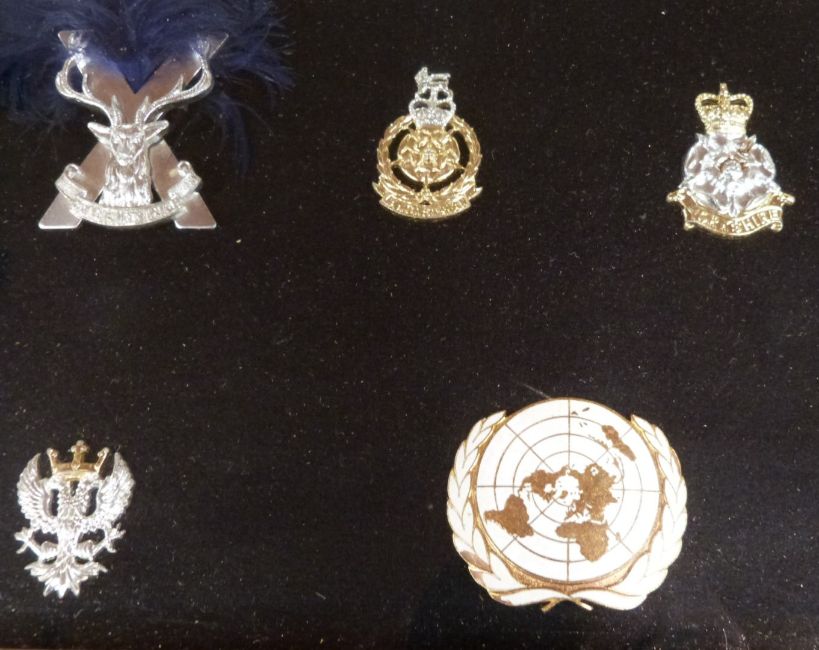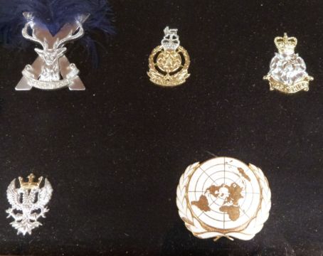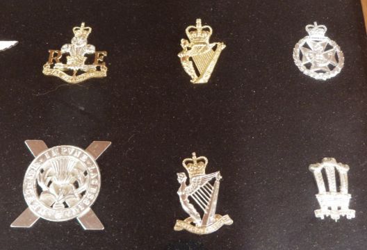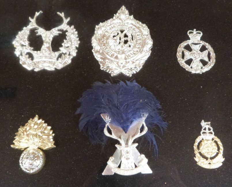 Forty-nine British Army cap badges including Royal Scots, Anglia Regiment, Highland Light Infantry, Royal Irish Rangers, Gloucestershire Regiment, Royal Hampshire, Queen's Own Highlanders, Gordon Highlanders, Wessex Regiment, etc, in glazed frame