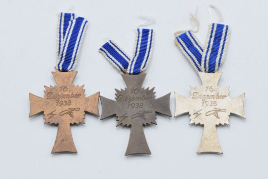 Three German WW2 Third Reich Nazi Mother's Cross Medals comprising gold, silver and bronze award examples