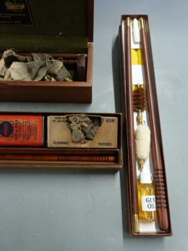 Three shotgun cleaning kits comprising one William Powell & Son with snapcaps and oil bottle in fitted wooden box, one Webley and one other.
