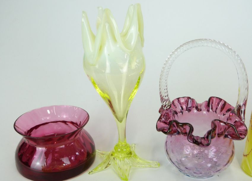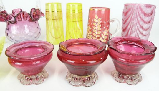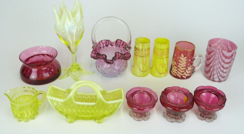 Twelve pieces of 19th/20thC Stourbridge and similar cranberry, vaseline and uranium glass including salts, baskets and vases, largest 19.5cm tall.