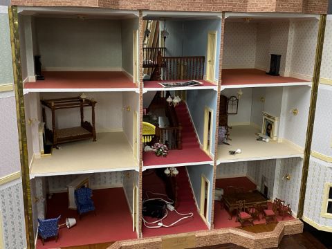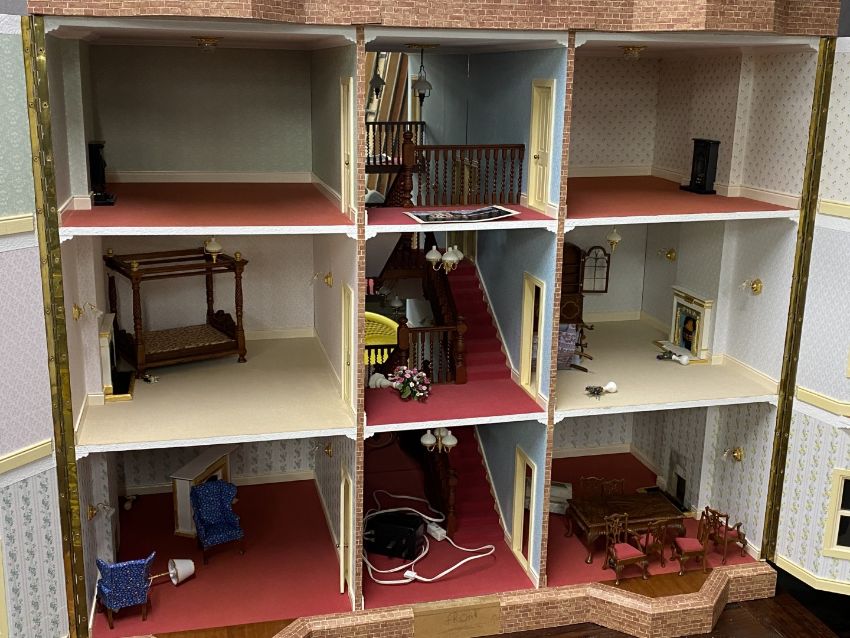 A scale model dolls' house, believed to be a replica of Linden House, Gorsley, Gloucestershire, with bespoke marquetry furniture, electric lights and castellations (not fitted), W105 x D56 x H107cm