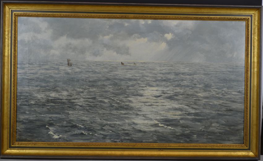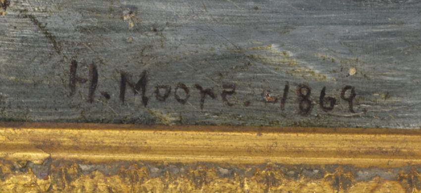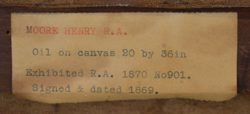 Henry Moore R.A., R.W.S (1831-1895) oil on canvas maritime scene with ships in the distance, signed and dated 1869 lower left, 49 x 90cm, in gilt frame with label verso suggesting it to have been exhibited at the RA in 1870 and being number 901