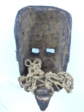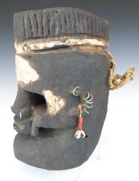 African tribal carved wood mask with multiple piercings and shell earrings, H35cm