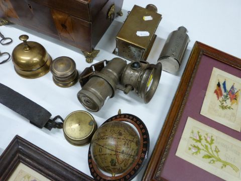 Hallmarked silver mounted leather 'Bridge' box, trench art containers, model engines, desk bell, WW1 silk postcards, antique lamps, animal traps, Astro MkII compass etc