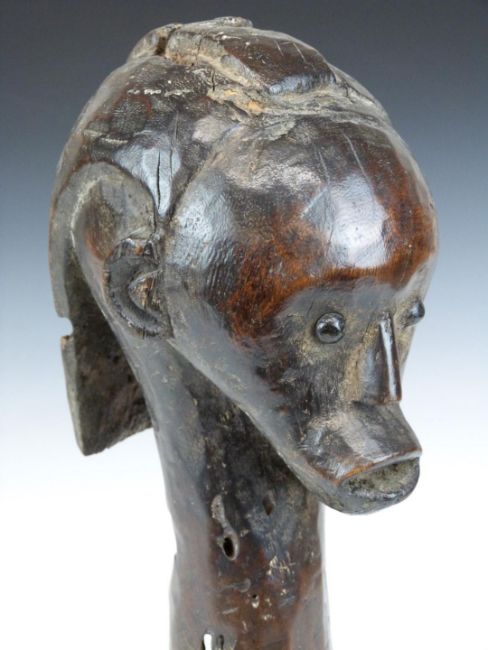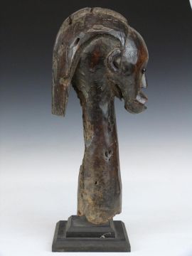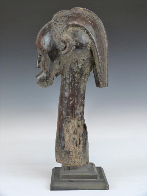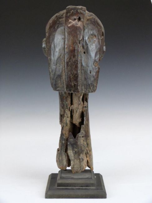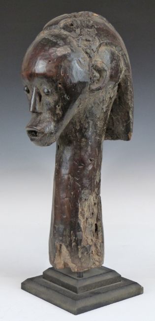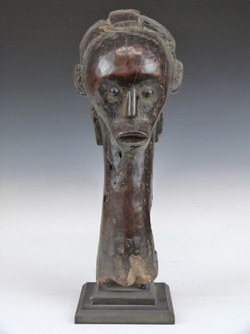 African tribal carved wood Fang head with long cylindrical neck and historic termite activity to the back of the piece. For similar please see Sotheby's London June 23rd 1986 Lot 62 £25,000 - £35,000