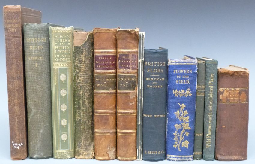 [Natural History] The Florist & Garden Miscellany 1850. Flowers of The Field by Rev. Johns (c.1859) gilt cloth. Handbook of The British Flora 1887. A Synopsis of the British Diatomaceae by William Smith 1856 with plates by Tuffen West. Adventures in Bird-land. History of British Birds by Yarrell 1843 (Volume 1 only). History of the British Sessile-Eyed Crustacea by Bate & Westwood 1863 in 2 volumes. Flora Germanica 1830 + copy of Half Hours with The Telescope 1902  (12)