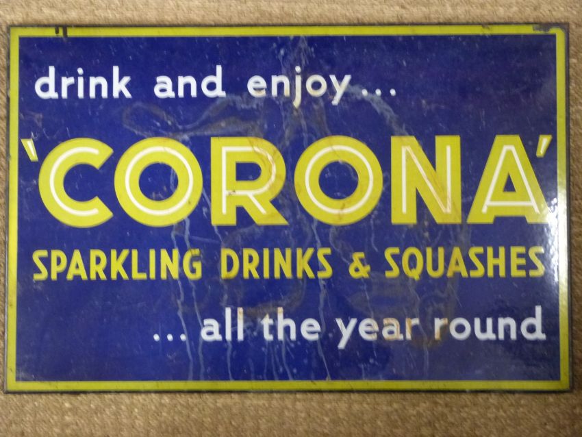 Corona vintage enamel advertising sign 'Drink and enjoy Corona sparkling drinks and squashes all year round', 39 x 74cm