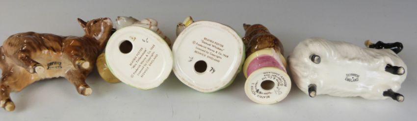 Five Beswick items comprising Beatrix Potter figures including Tailor of Gloucester, a Highland calf and a sheep, tallest 9cm