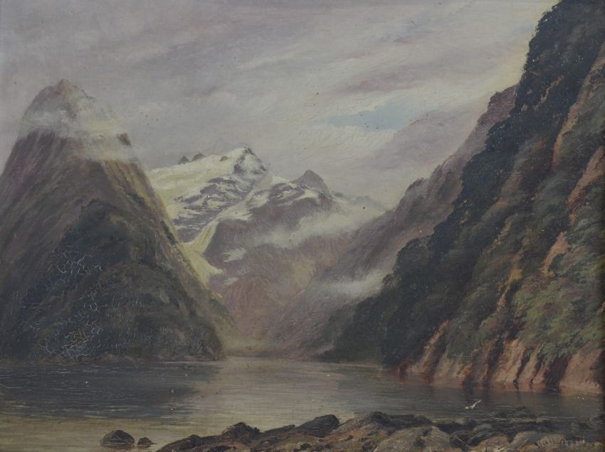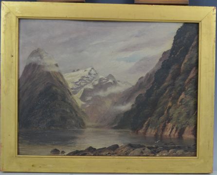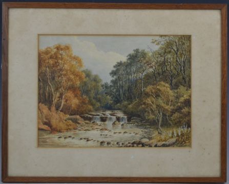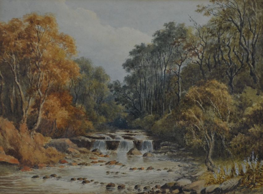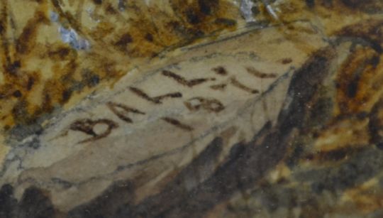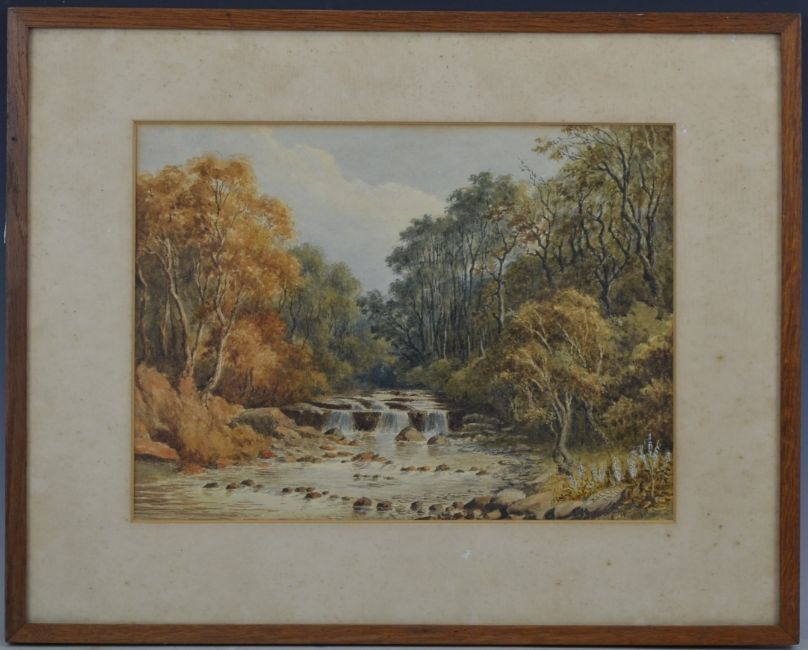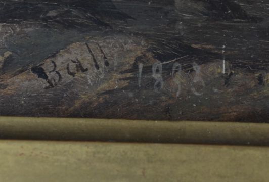 Victorian watercolour landscape waterfall with autumnal trees, signed Ball and dated 1871 lower right, together with an oil by the same artist of a lake with snow capped peaks beyond, both approximately 25 x 34cm