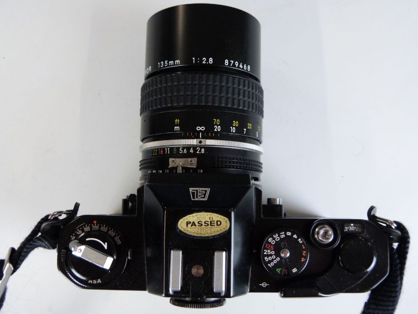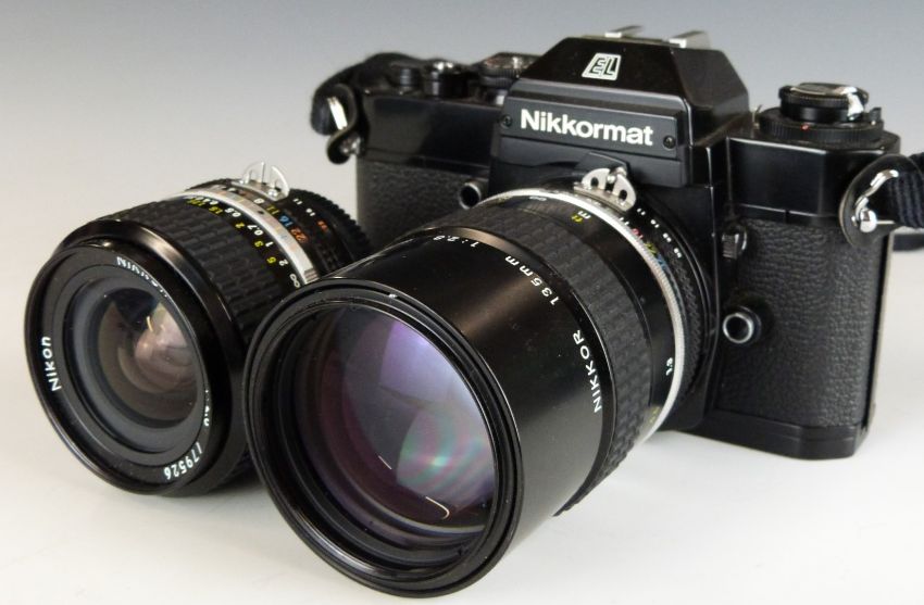 Nikon Nikkormat EL SLR camera with 135mm 1:2.8 lens and further 24mm 1:2.8 lens