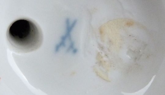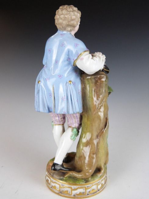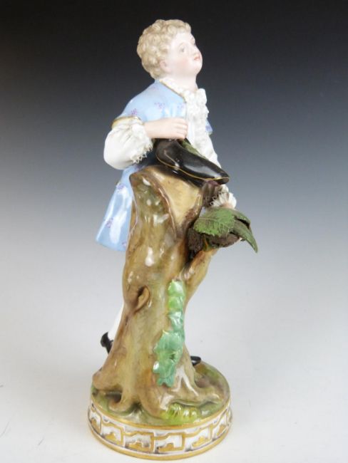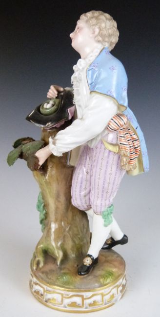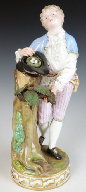 Meissen figure of a man with bird's eggs in his hat, leaning on a tree stump, H19cm