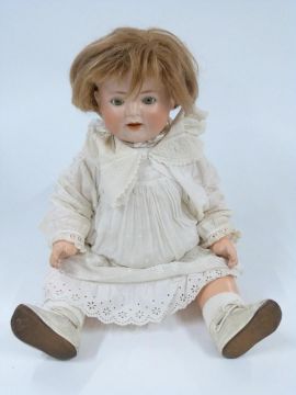 Schoenau and Hoffmeister bisque head doll with applied hair, sleep eyes, open mouth, moving tongue, composition body and jointed limbs, Porzellan Fabrik Burggrub 169-7 to neck, L 66cm.