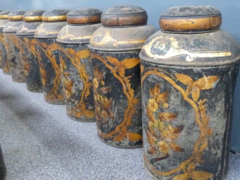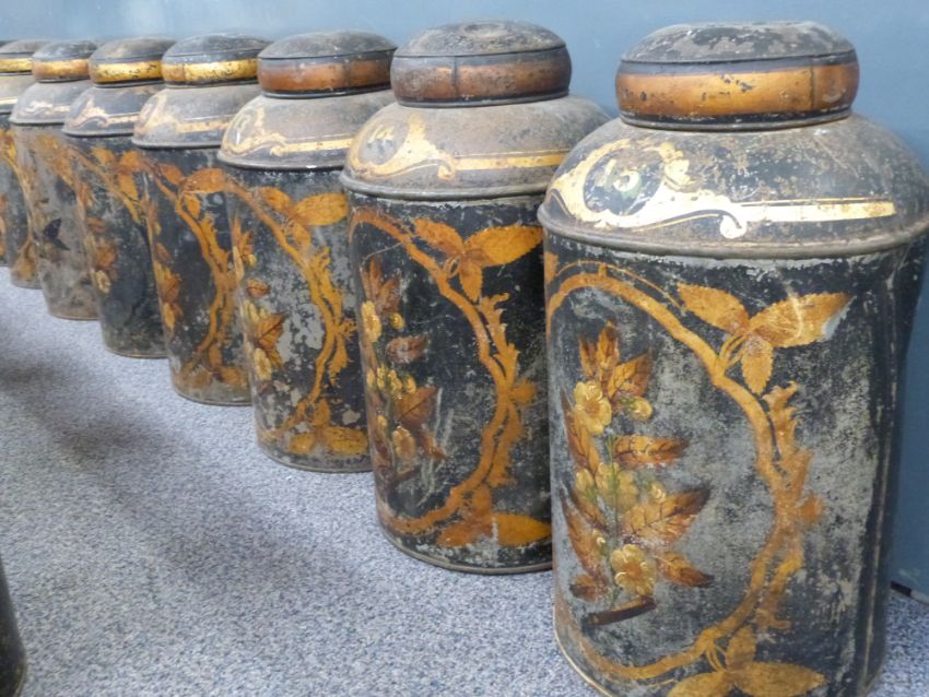 A set of fifteen 19thC/20thC numbered tin / tableware tea / botanical shop display / advertising canisters by Bartlett & Son, Welchback, Bristol. Obtained by the vendor's family when they purchased a shop W C Fowlers shop located at 135 High St. Tewkesbury. Shopfitting / haberdashery interest, H43 x D24cm