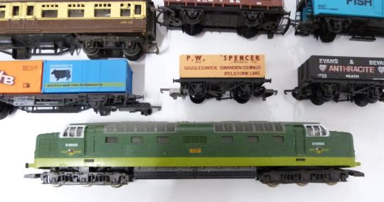 Sixteen Hornby and similar 00 gauge model railway locomotives, coaches and wagons comprising Lima class 55 diesel, seven coaches and eight goods wagons