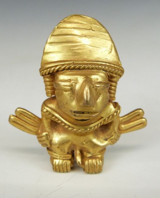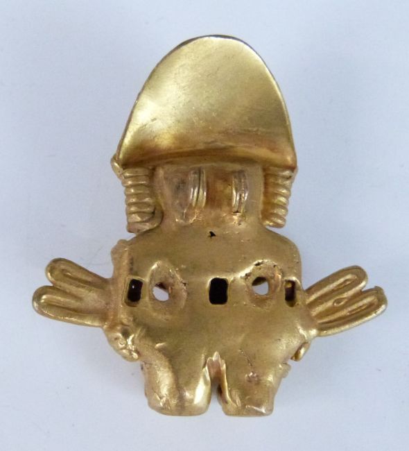 Colombian gilt metal figure with suspension loops verso, H5.5cm