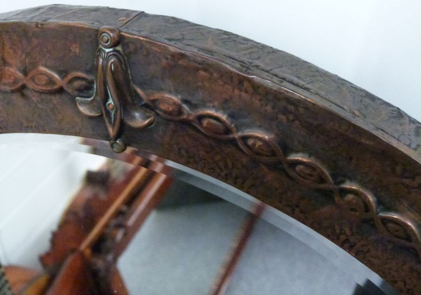 Arts and Crafts / Art Nouveau copper framed circular mirror with bevelled glass, diameter 55cm