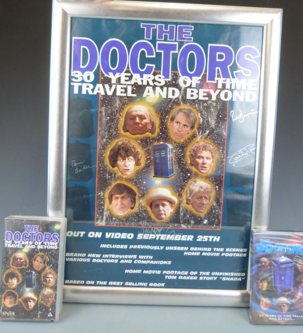 PLEASE NOTE THE VIDEO AND FRAME ARE NOT INCLUDED WITH THIS LOT Dr Who video movie poster 'The Doctors 30 Years Of Time Travel And Beyond' hand signed by four of the Doctors, believed to be one of only eight together with the DVD of the film, size of poster 58 x 40cm