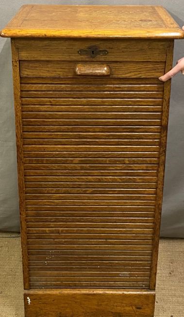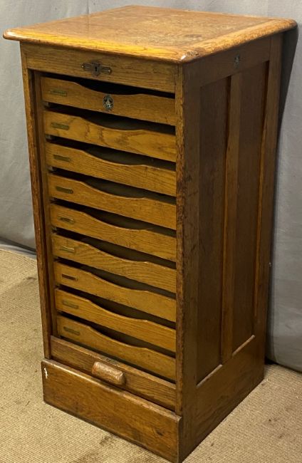 Crusader oak tambour fronted collector's chest or filing cabinet with nine drawers, brass fittings and original labels, W56 x H111 x D54cm