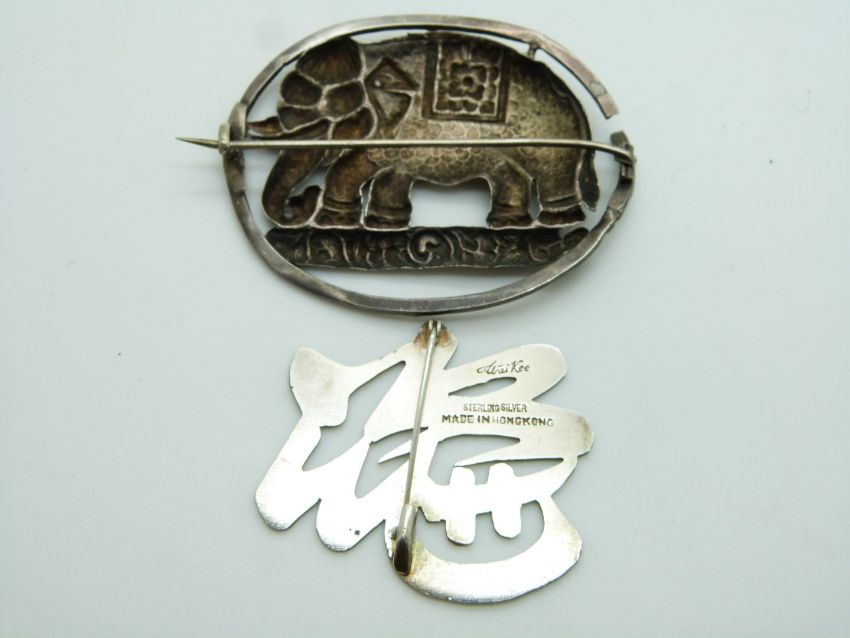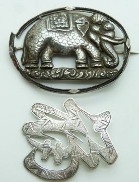Chinese silver brooch by Wai Kee and a white metal brooch depicting an elephant