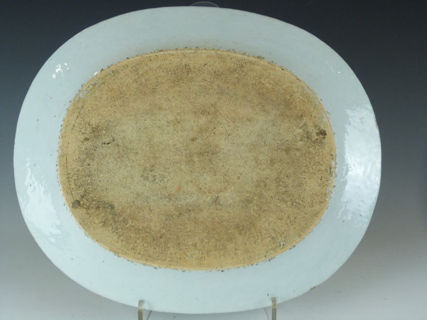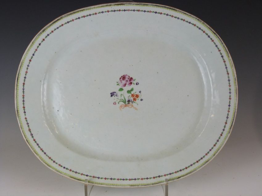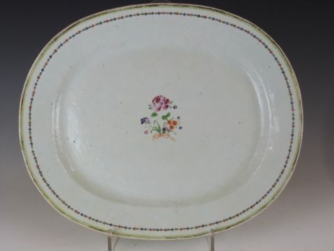 A 19thC Chinese famille rose oval plate with central floral decoration, 33x38cm