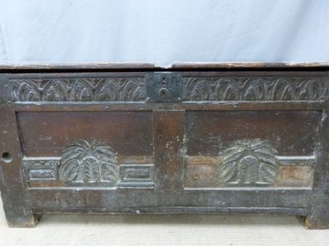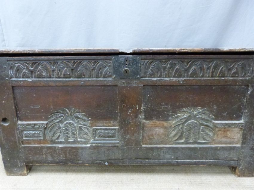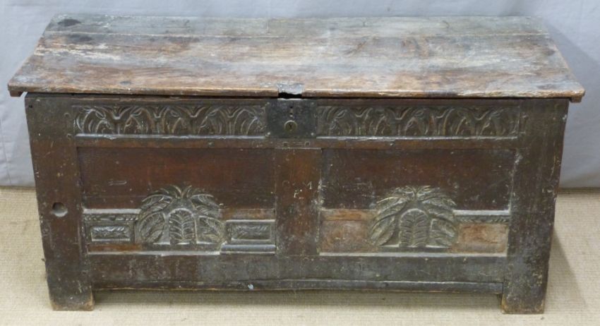 17th/18thC carved oak trunk, W110 x D47 x H52cm