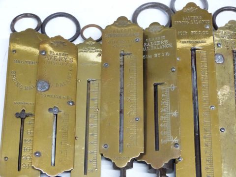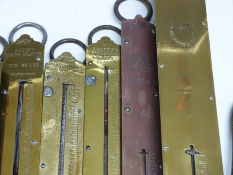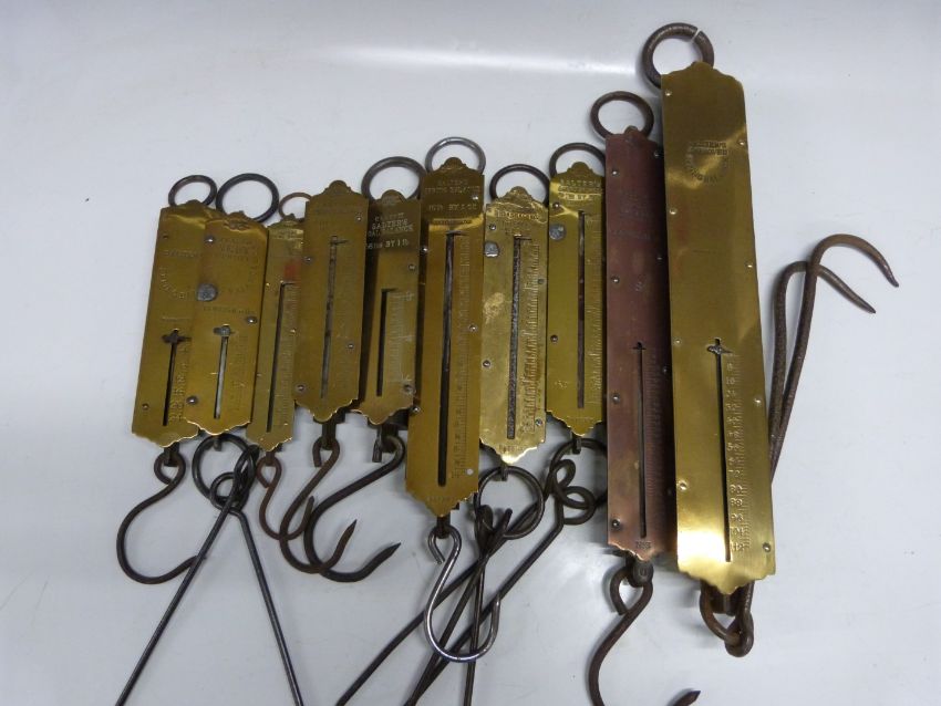 Ten Salter spring balances including 56lb coal balance, 4lb bread balance, 10lb, 6lb, 112lb and further 112lb hooked examples,