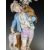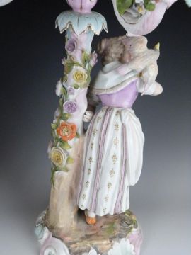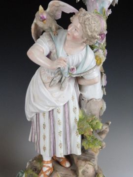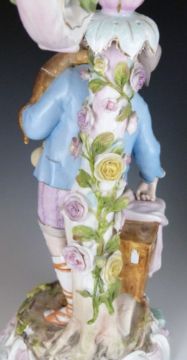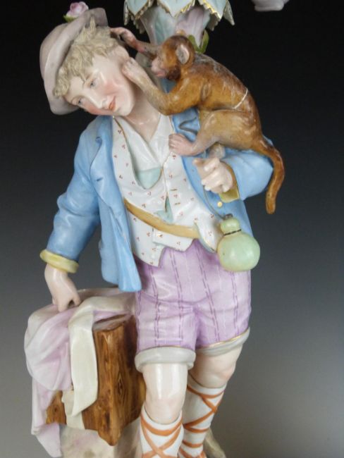 A pair of 19thC German figural candelabra, one with a monkey on the shoulder of a male figure, the other a parrot to the shoulder of his female companion, H53cm