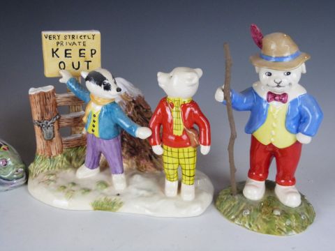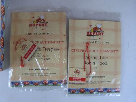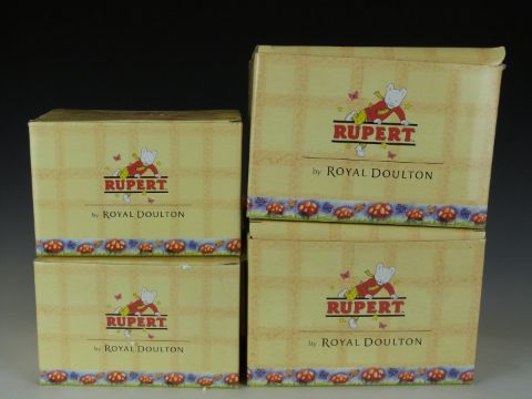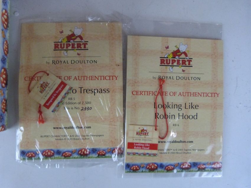 Four Royal Doulton Rupert the Bear figures in boxes comprising Tempted To Trespass, Looking Like Robin Hood, Rupert Rides Home and Leading The Way, two with certificates