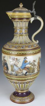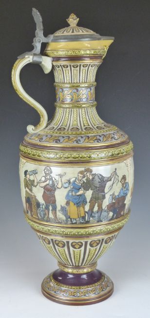 German Mettlach large pedestal marriage ewer with pewter mount, decorated with musicians drinking and dancing figures, the pewter lid inscribed A Westendaup BCR, Bremen 13/9/85, impressed 1159 to base, H52cm