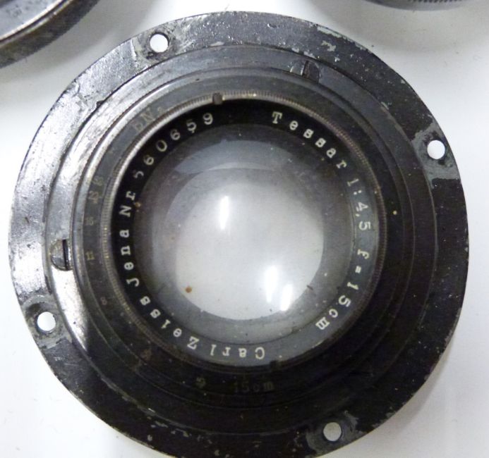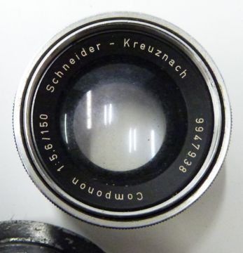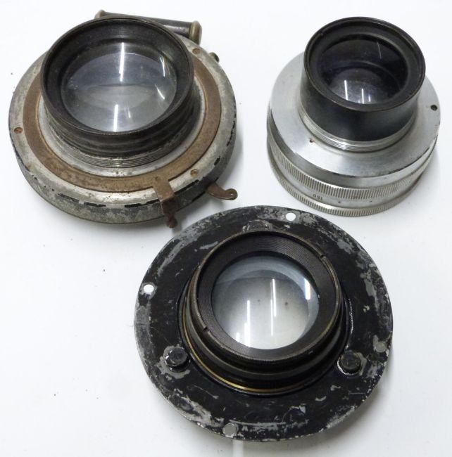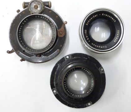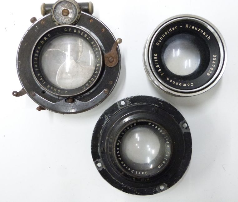 Three camera or similar lenses comprising Schneider Kreuznach 1:5.6/150 Componon, Zeiss Tessar 1:4.5 f=15cm and Goerz Dogmar 1:4.5 f=180mm