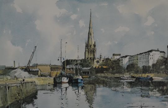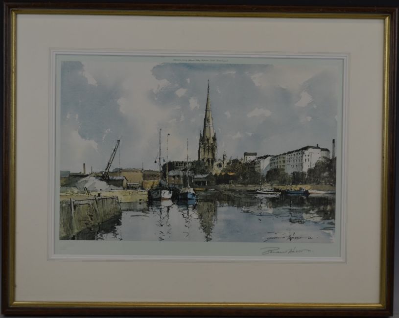 Edward Wesson (1910-1983) signed print Bristol harbour scene with boats and church beyond, with blind stamp to margin, 35 x 51cm, in gilt frame