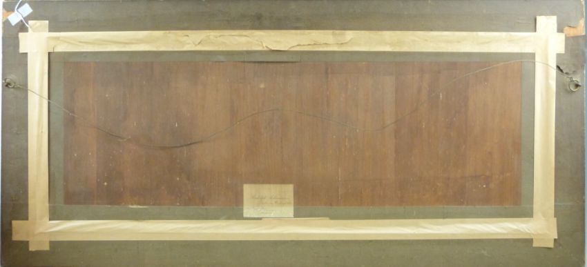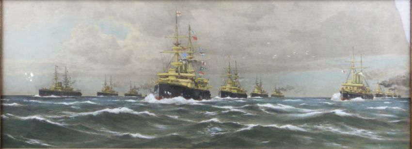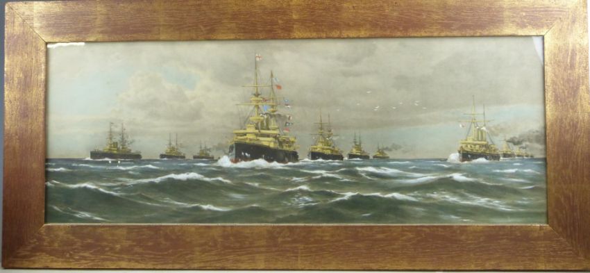 Early 20thC naval print, in period frame, overall size 49 x 105cm