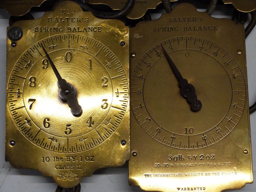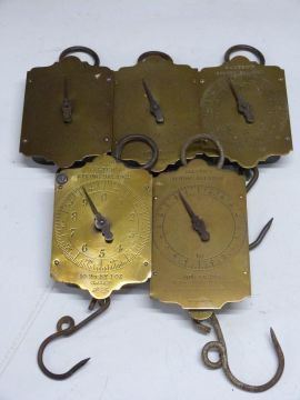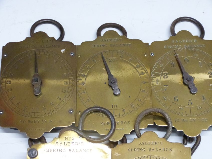 Five Salter spring balances comprising No 2 10lb and 10, 20, 30 and 40lb examples