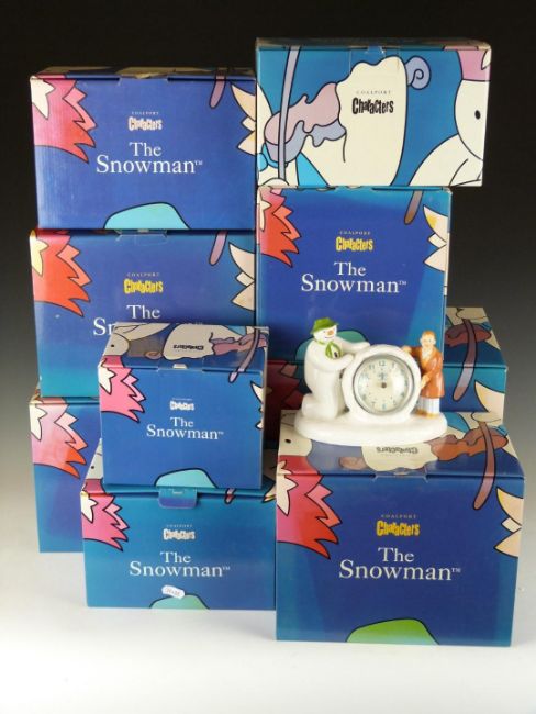 Thirteen Coalport The Snowman figures including Toothy Grin, Hold On Tight, Dinner For Two, Soft Landing, The Bashful Blush, Penguin Pals, clock etc, all but the clock with boxes