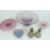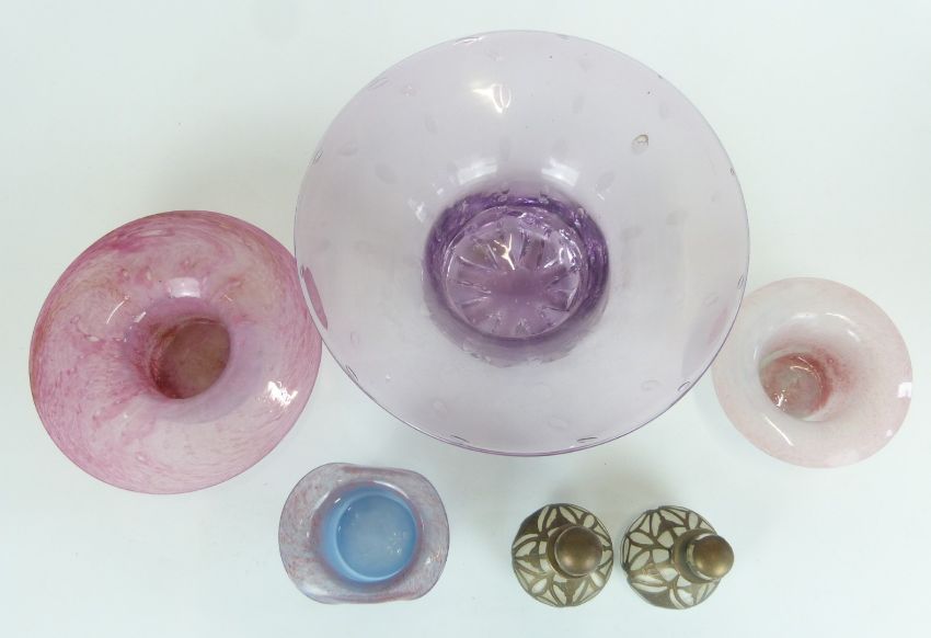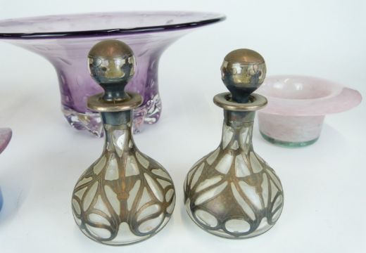 Six pieces of decorative glassware including Monart/ Vasart style bowls, control bubble bowl and a pair of 'silver' overlaid scent bottles, largest 24.5cm in diameter.