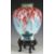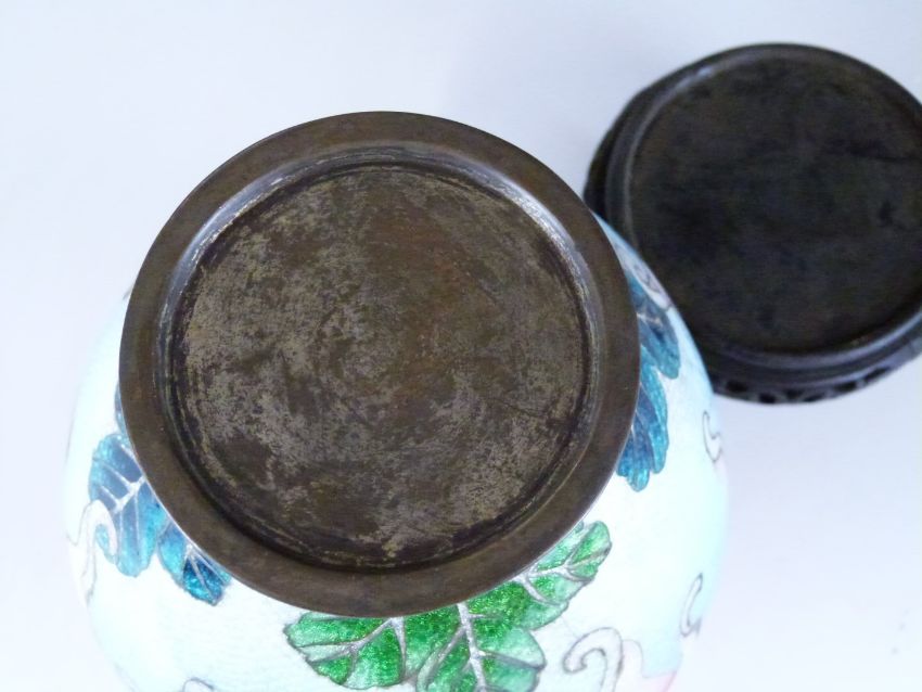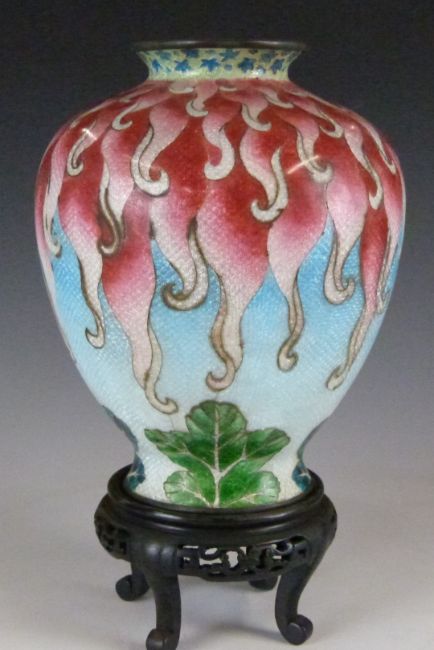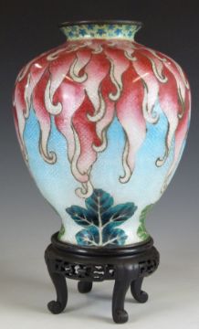A late 19th/20thC Japanese Ginbari silver vase on stand, decorated with red tendrils on a pale blue ground, H19cm
