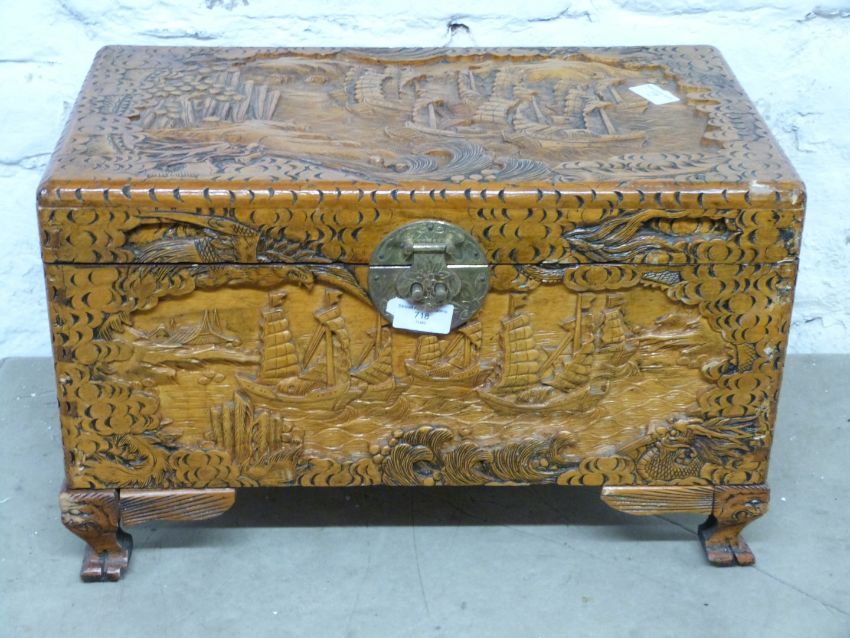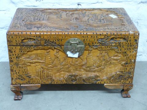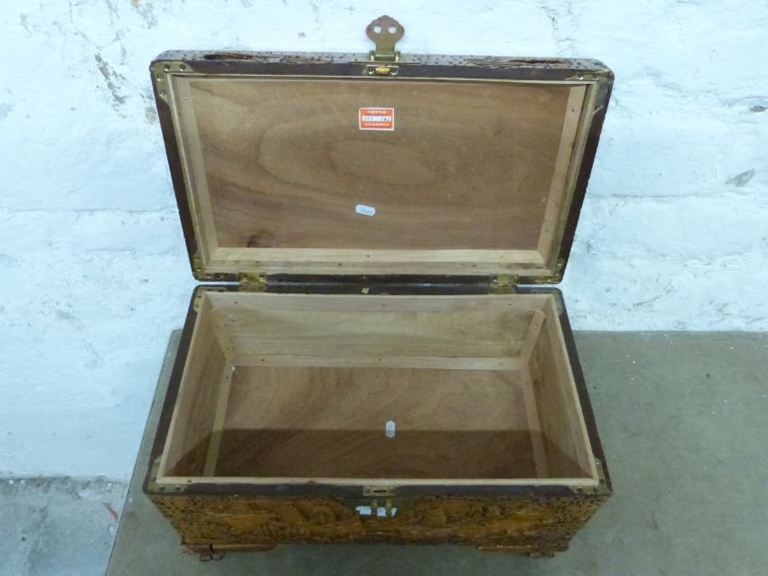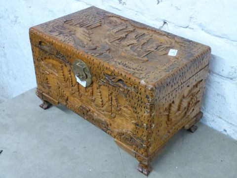 Small Chinese camphorwood chest with carved decoration, W51cm