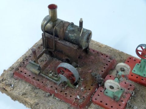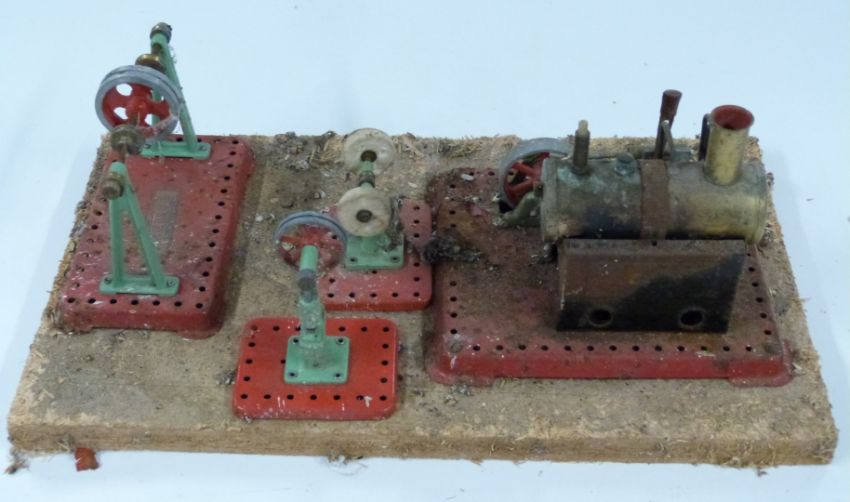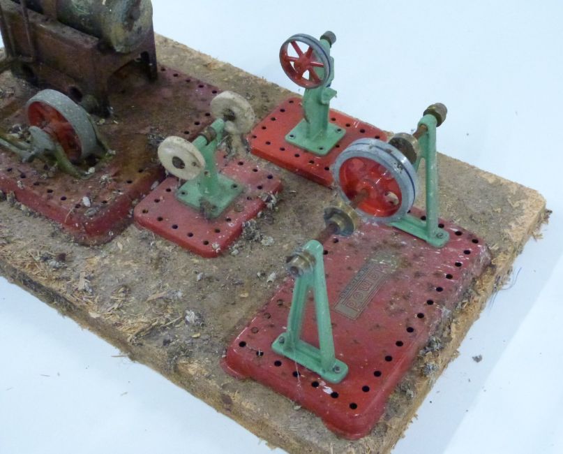 Mamod SE2 live steam engine on base together with line shaft, power press and buffing wheel accessories